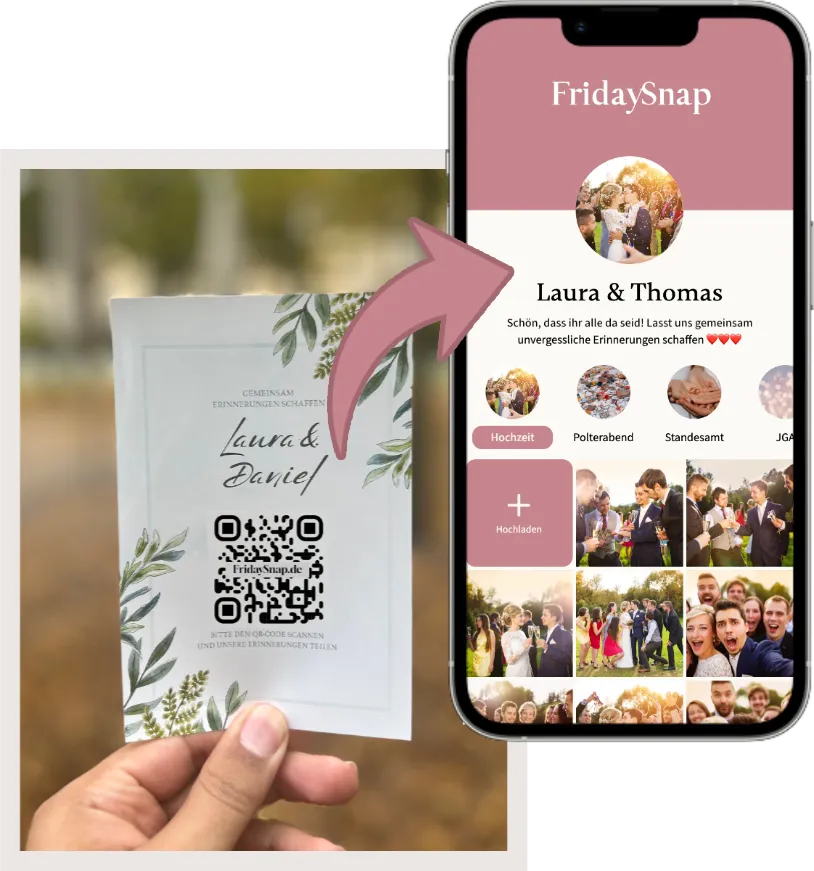Wir haben für euch personalisierbare Kartendesigns erstellt, damit ihr euren Hochzeits QR-Code euren Gästen wunderschön präsentieren könnt. Damit motiviert ihr eure Gäste, Fotos zu sammeln und mit euch zu teilen.