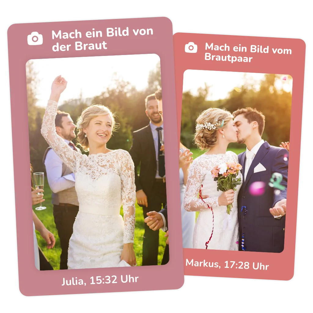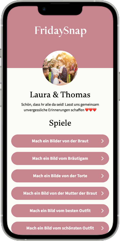 Mit FridaySnap kannst du deine Gäste mit Fotoaufgaben zum Fotos Teilen motivieren und ganz besondere Momente einfangen.