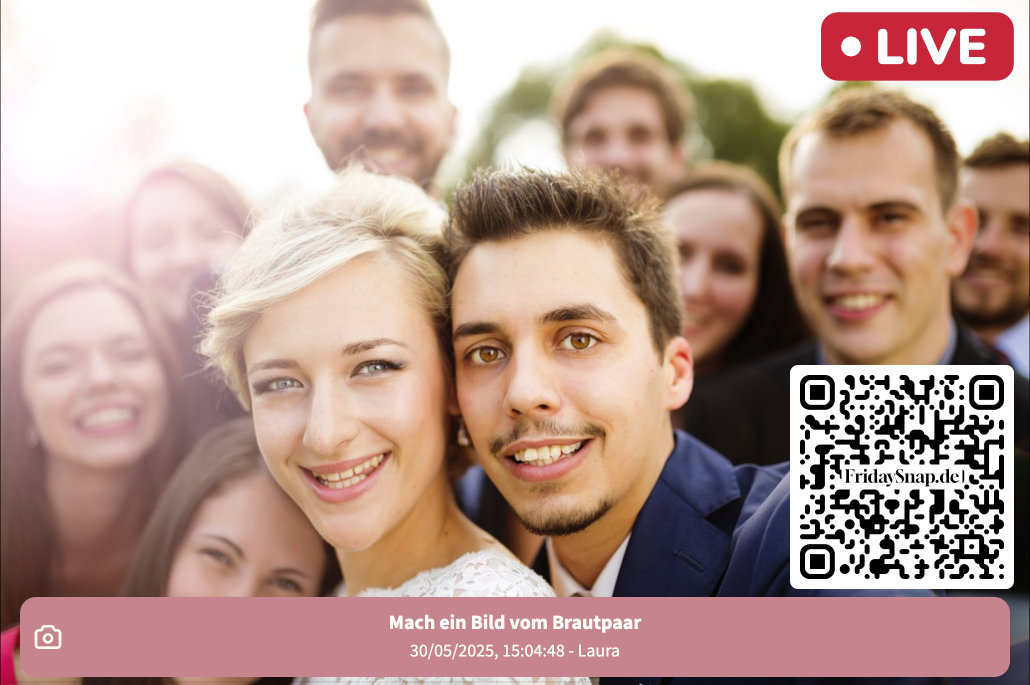 Mit unserer Liveshow kannst du einfach alle Hochzeitsfotos in Echtzeit streamen und die Fotoaufgaben live in einer Diashow anzeigen.